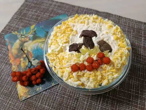 4. В салатнице формируем слои: первый слой — картофель, далее — жареные грибы, затем — сыр и в последнюю очередь — яиц. Каждый слой смазываем майонезом.