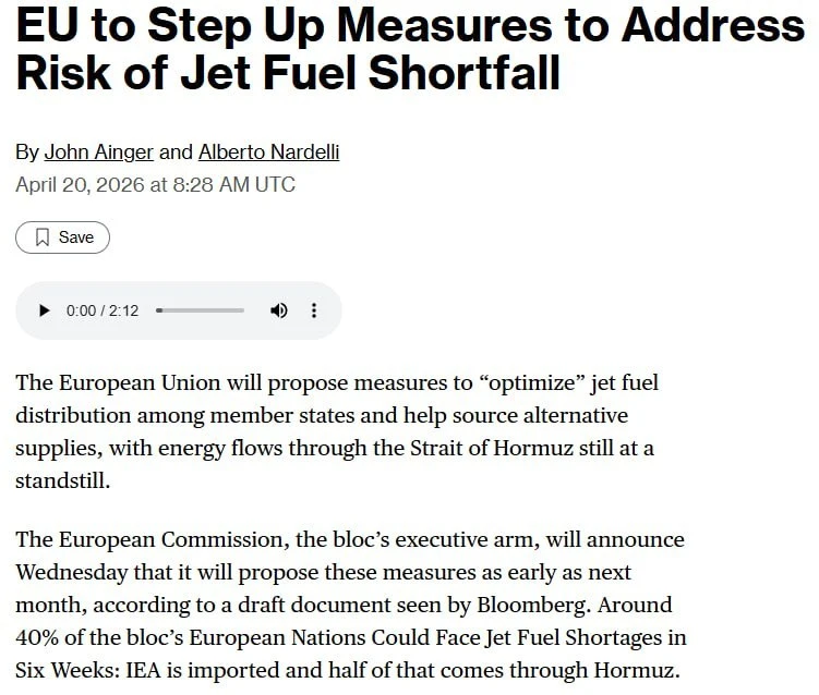 ЕС оптимизирует распределение авиатоплива из-за ближневосточного кризиса, — Bloomberg.