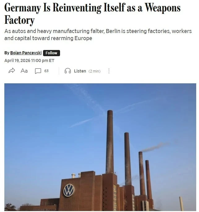 Германия переориентирует свою промышленность с автомобильного сектора на оборонное производство, фактически превращаясь в оружейный завод, — The Wall Street Journal.