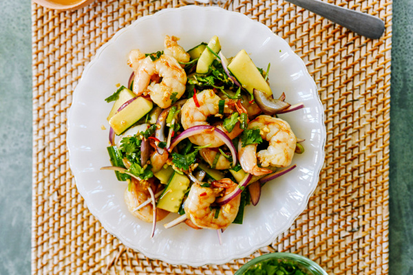 - Сборка: В миску с заправкой добавьте креветки, огурцы, красный лук и кинзу. Тщательно перемешайте и подавайте немедленно, чтобы салат оставался свежим.