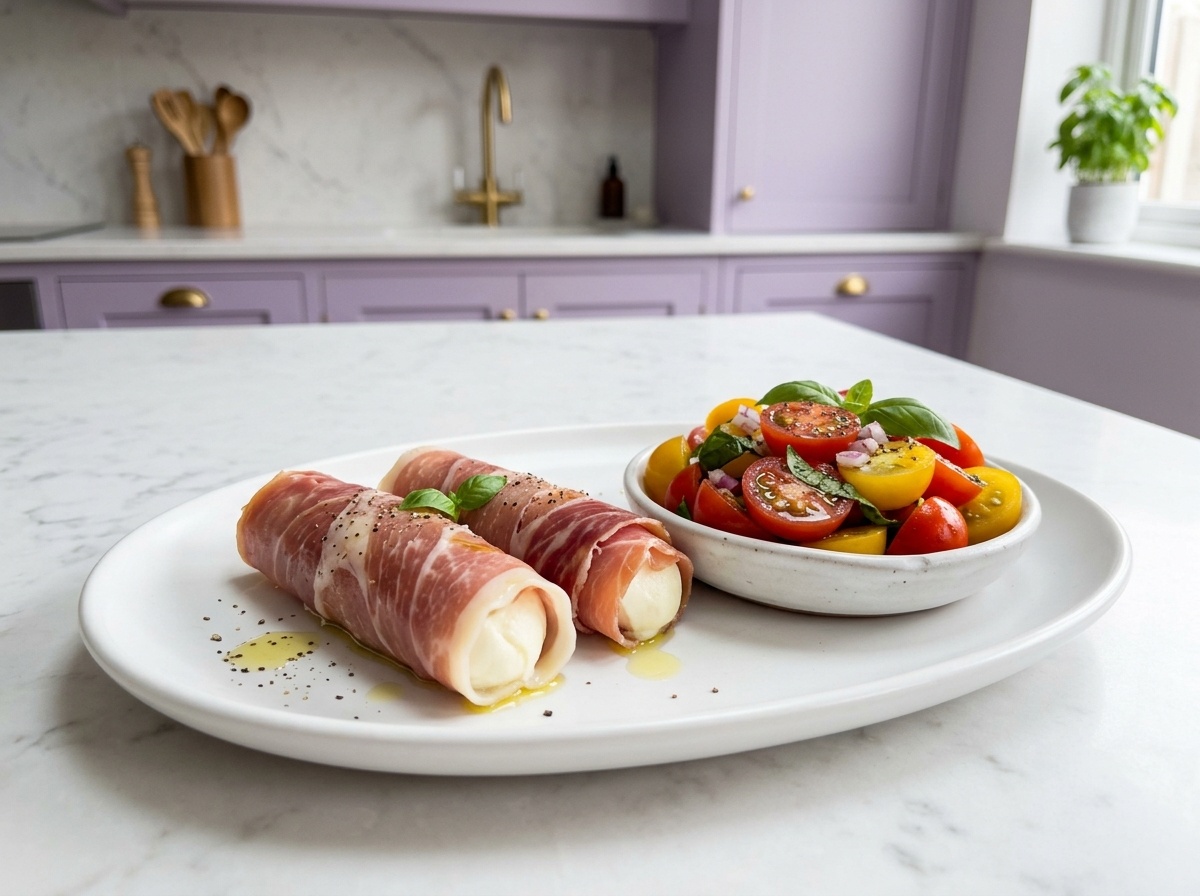 Тонкие ломтики прошутто обвивают благоухающий сыр моцарелла, создавая идеальный баланс соленого и сливочного вкуса. В дополнение к этому идет свежий салат из томатов черри, ароматного базилика и оливкового масла, с легкой кислинкой яблочного уксуса. Такой дуэт отлично уравновешивает жирность прошутто и сыра, даря истинное наслаждение каждому укусу.
