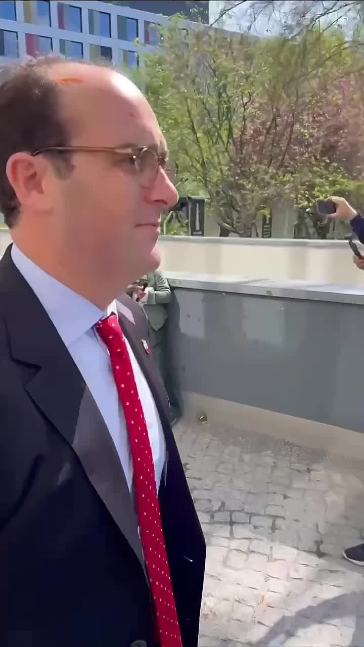 Сын иранского шаха Реза Пехлеви был облит красной жидкостью, предположительно томатным соком, после публичного выступления в Берлине, Германия