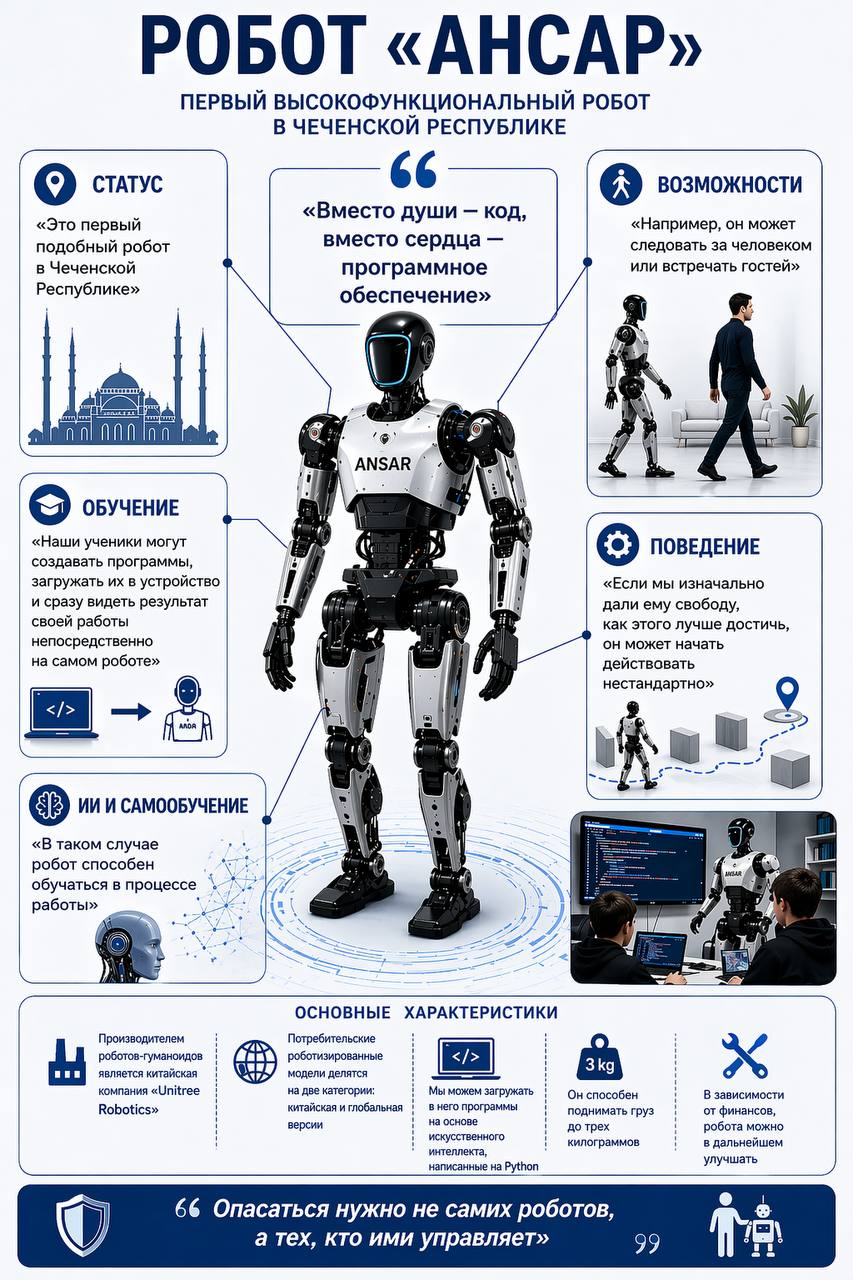 «Ансар» является первым высокофункциональным роботом на территории Чеченской Республики. Сегодня он применяется в образовательном процессе школы программирования. О его возможностях и перспективах корреспонденту ИА «Чечня Сегодня» рассказал основатель аккредитованной IT-компании «Ansarium» и школы программирования «Ansar» Юнус Гелдабаев.