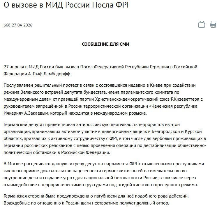 Послу Германии заявили решительный протест в связи со встречей депутата бундестага с руководителем организации "Чеченская республика Ичкерия"* Ахмедом Закаевым