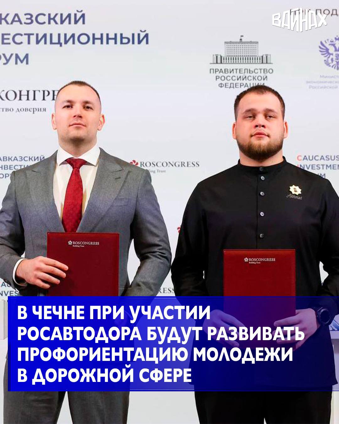 На Кавказском инвестиционном форуме подписано соглашение о взаимодействии между министерством Чеченской Республики по делам молодежи и Федеральным дорожным агентством (Росавтодор) в сфере реализации государственной молодежной политики. Документ подписали заместитель министра Абусайд Висмурадов и председатель Молодежного совета Росавтодора Леонид Остроухов.